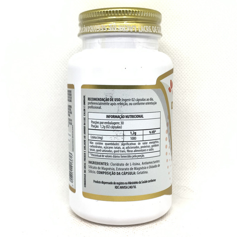 Suplemento com lisina, um aminoácido essencial que contribui para a saúde dos tecidos, formação de colágeno e fortalecimento do sistema imunológico.