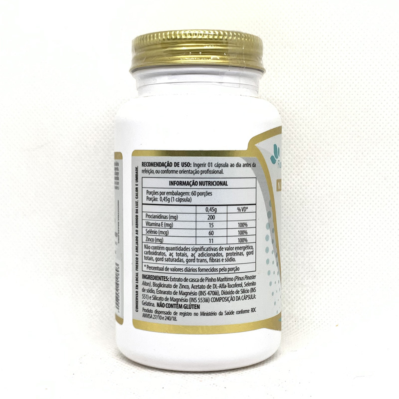 Suplemento com extrato de Pinus Pinaster, um potente antioxidante que ajuda a combater os radicais livres e promove a saúde cardiovascular.