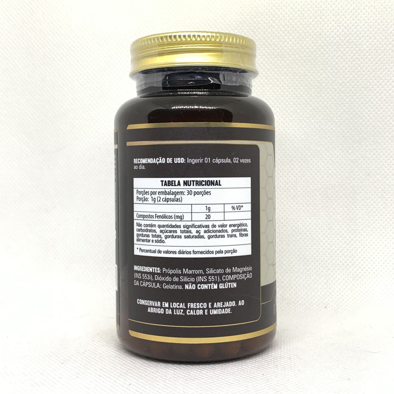 Suplemento com própolis marrom, conhecido por suas propriedades antioxidantes e imunológicas, auxiliando na proteção do organismo.