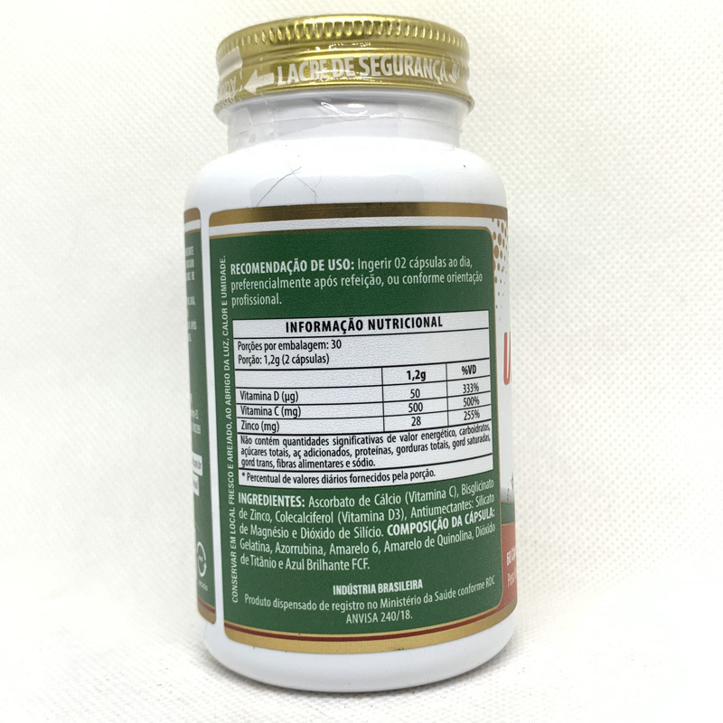 Suplemento de vitaminas C e D3 com zinco, essencial para fortalecer o sistema imunológico e combater infecções.